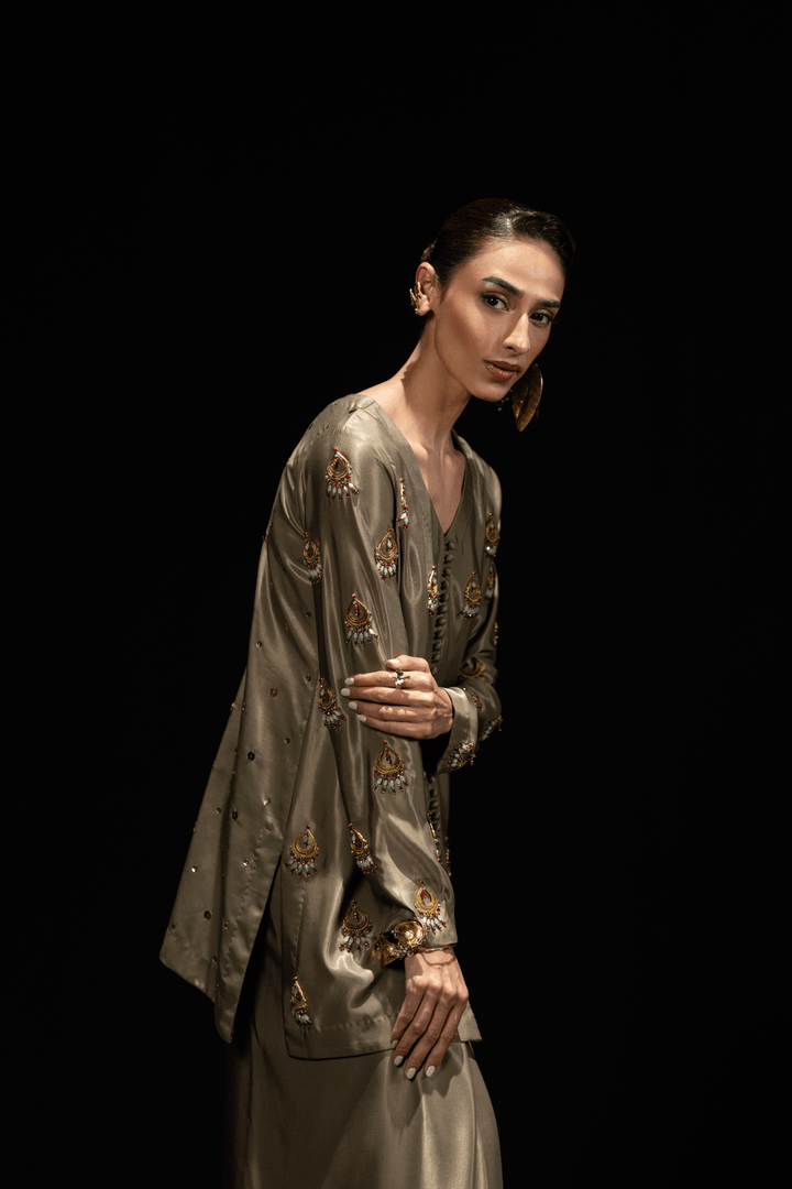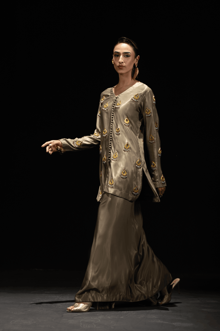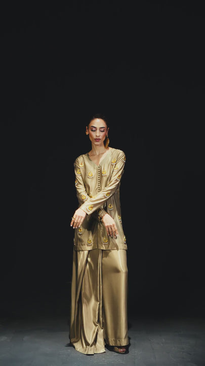 Two piece pure silk outfit in tones of bronze golds. Top comes with hand embroidered gold jewels giving the perfect royal look. The statement pieces highlights the sleeves as well. Comes with front open style as show buttons and spray at back. Bottom is a beautiful pre draped saree look in pure silk. The complete outfit trendy yet classic.