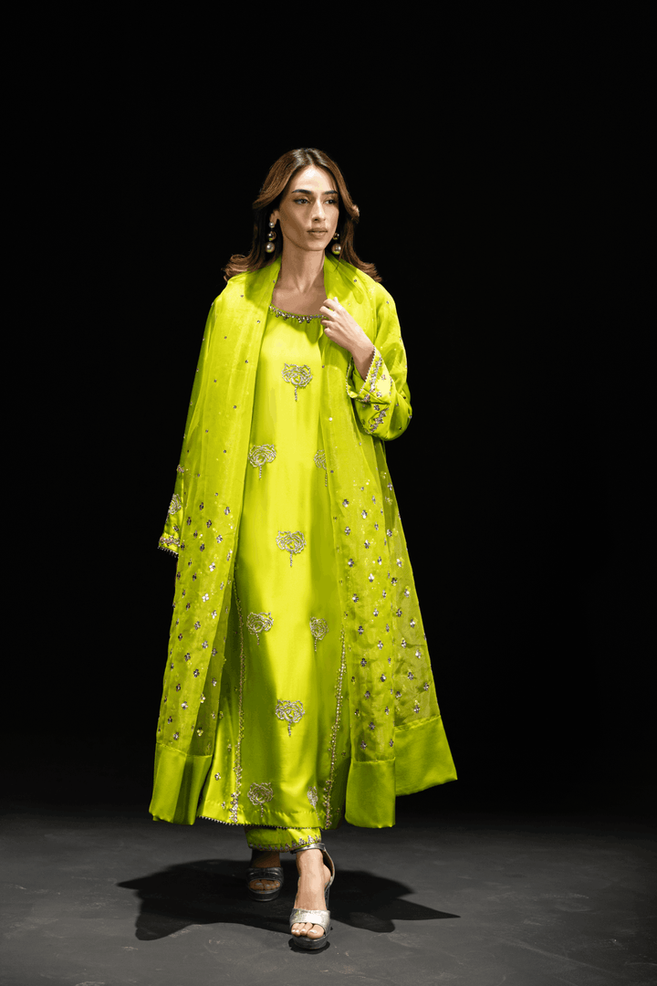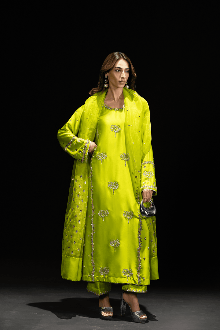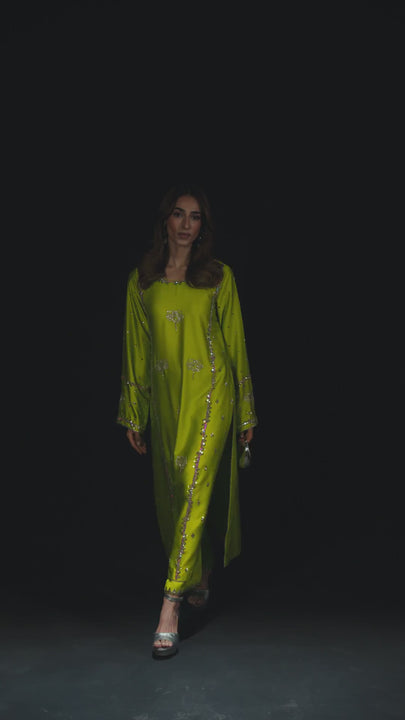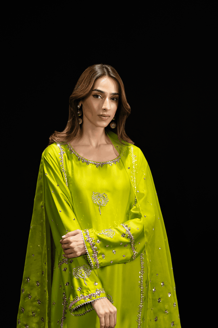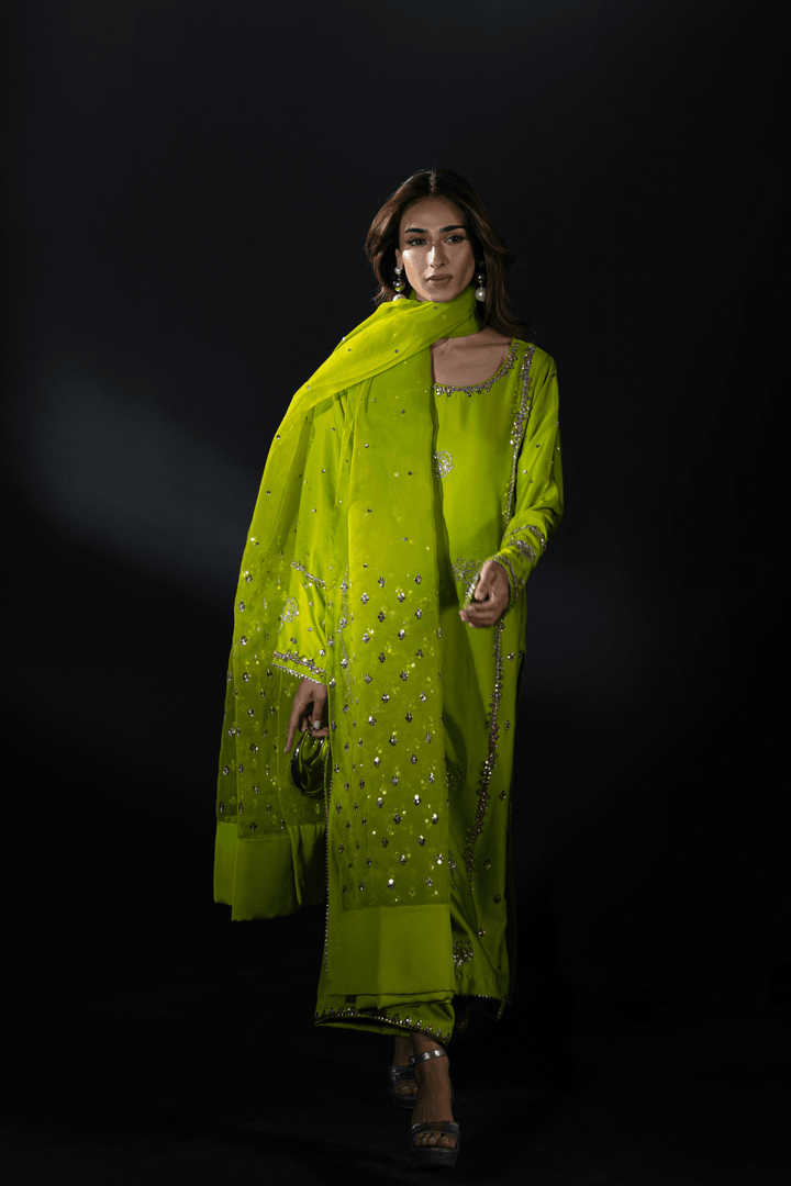 A classic three piece set in perfect shade of neon lime in pure silk. Shirt is hand embroidered with perfect sparkly accessories. Comes with beautiful embroidery on neckline , sleeves and back. Paired with hand embroidered azaar pant and beautifully embroidered dupatta with all glitters and sparkles.