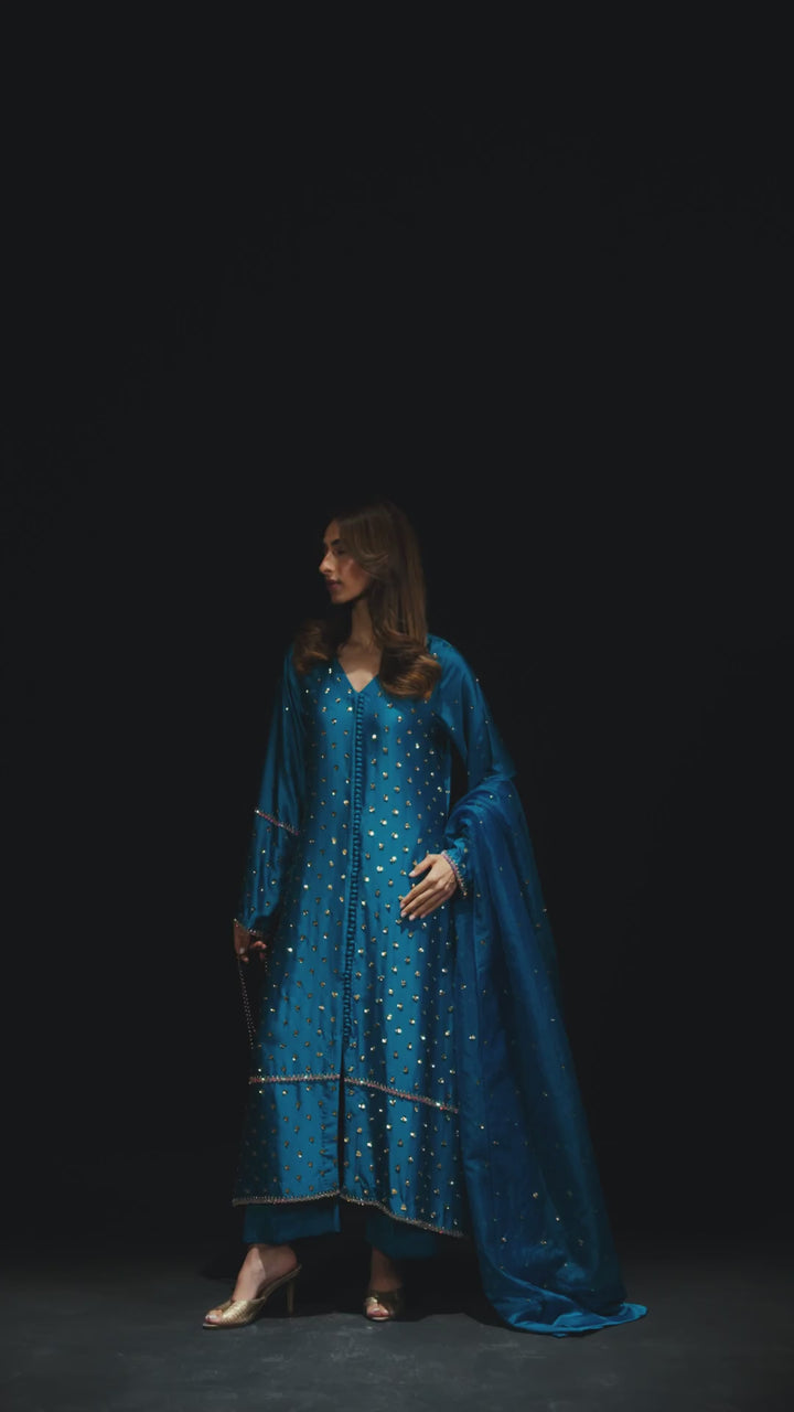 Three piece outfit with perfect shade of blue in pure silk. Comes with superb sheen in perfect wide cut drape with all glitters hand embroidery using sequins and Swarovski style crystals. Comes with hand embroidered dupatta with perfect sparkles and wide cut azaar pant.